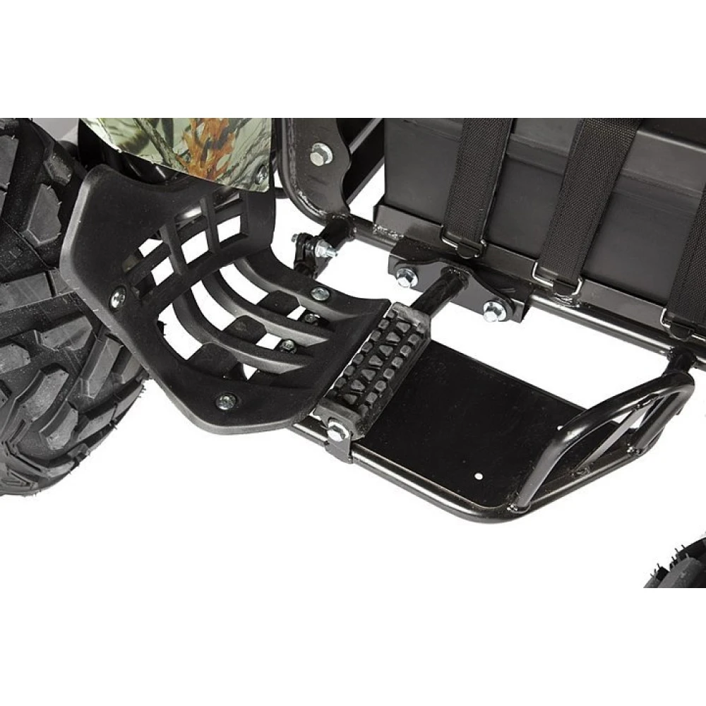 Электроквадроцикл укомплектован багажником, зеркалами заднего вида, охранной сигнализацией, безотказной тормозной системой.