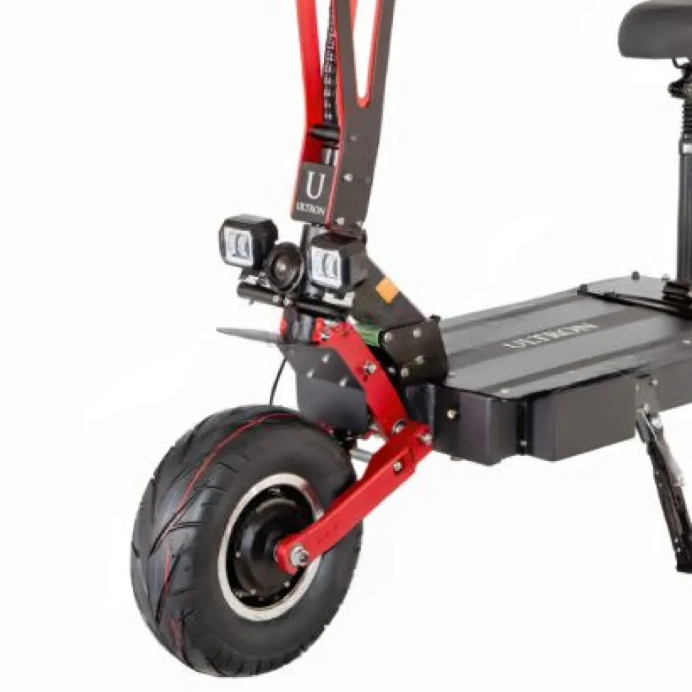 Техника оснащена полным приводом, относится к категории вездеходной. Для электросамоката не станет помехой езда по препятствиям, бездорожью, в ненастную погоду. При полном заряде АКБ транспортное средство с легкостью преодолеет 100 км пути. Чтобы езда была плавной и комфортной производитель предусмотрел гидравлические тормоза и бесшумные контроллеры.